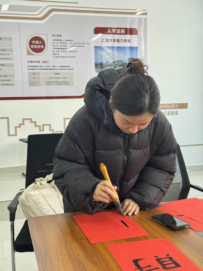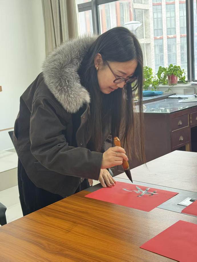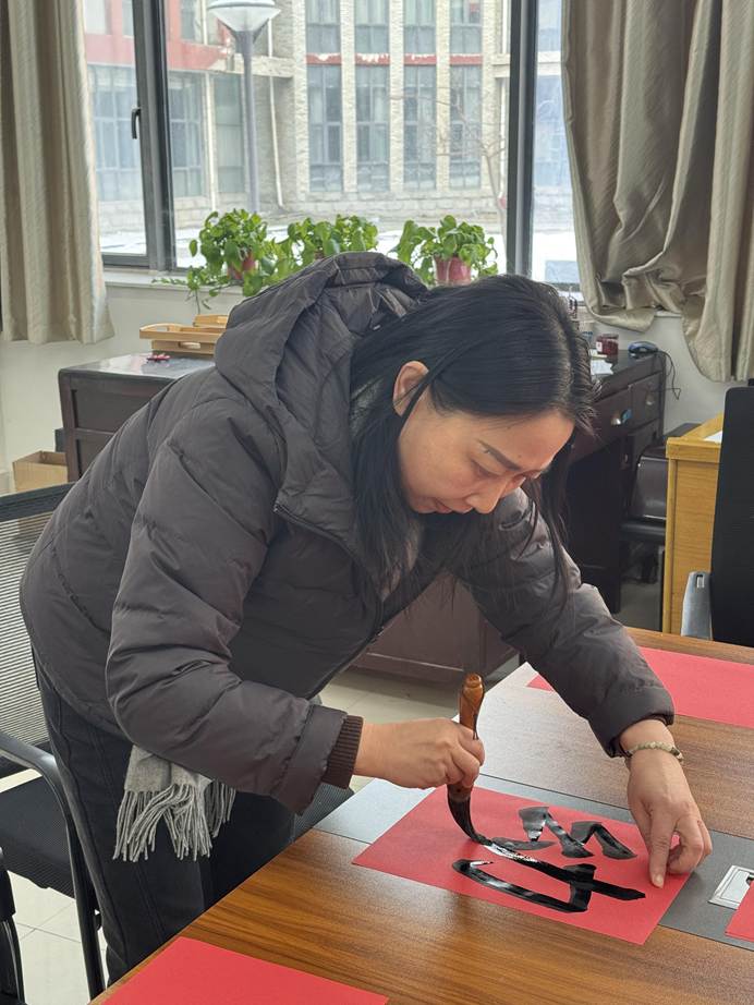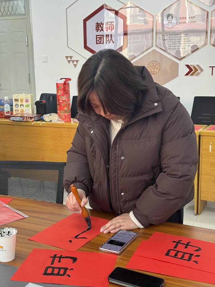 联欢会现场热闹非凡,上午狼人杀思维交锋、笑语不断;掼蛋搭档切磋、指尖欢弈,老师们互动暖心,满室融融;下午,红纸铺展,笔墨凝香,老师们挥毫书写春联,一撇一捺寄新春祝福,一笔一划藏美好期许,尽显传统年味。